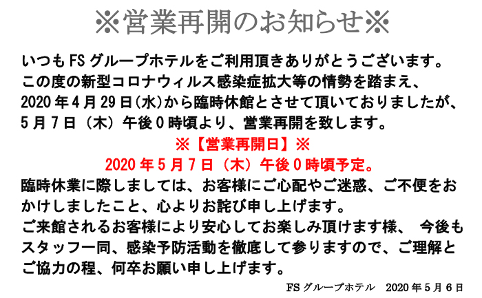 いつもFSグループホテルをご利用頂きありがとうございます。